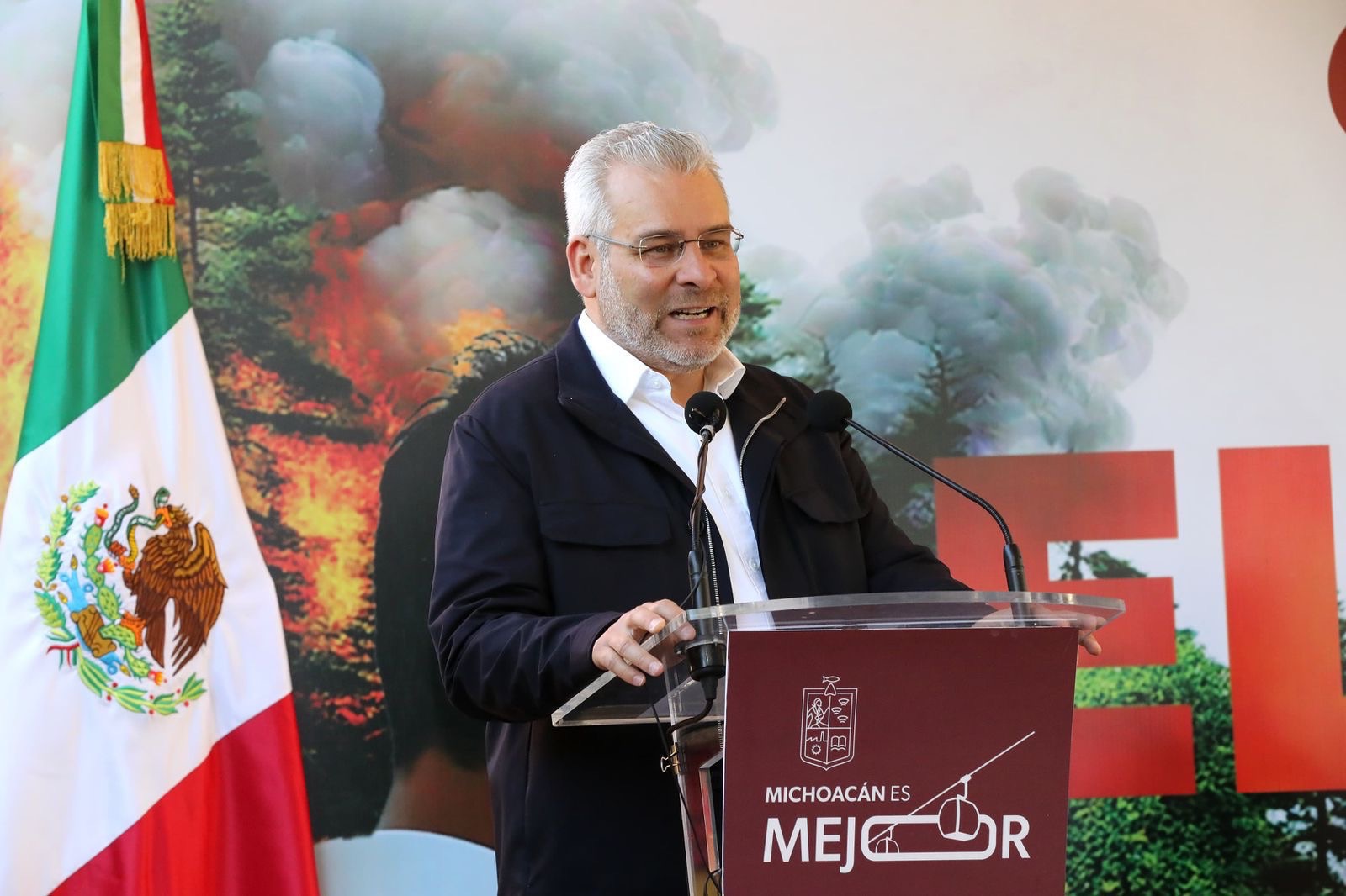 Pátzcuaro, Michoacán, 20 de febrero de 2026.- El gobernador Alfredo Ramírez Bedolla dio inicio a la campaña estatal de prevención y combate de incendios forestales 2026, la cual contará con 102 brigadas integradas por mil 200 combatientes, quienes tendrán respaldo aéreo mediante helicópteros para la atención oportuna de siniestros.