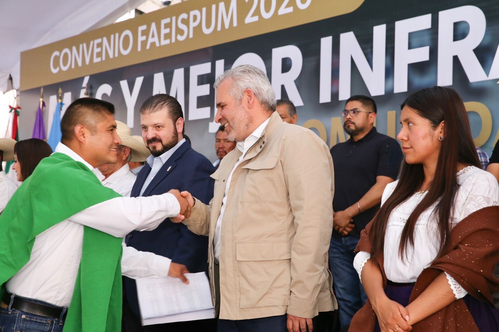 Morelia, Michoacán, 23 de marzo de 2026.- El gobernador Alfredo Ramírez Bedolla comprometió que este año todas las comunidades indígenas con autogobierno en Michoacán accederán a recursos para la construcción de obras públicas en beneficio de sus habitantes, al firmar el convenio del Fondo de Aportaciones Estatales para la Infraestructura de los Servicios Públicos Municipales (Faeispum) con las primeras 29 comunidades que se rigen por usos y costumbres.