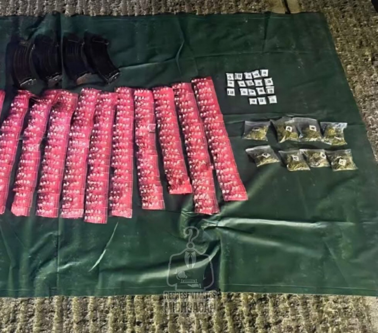 En su interior había cuatro cargadores para arma larga, más de 120 cartuchos calibre 7.62×39, 5,985 pastillas de éxtasis (1.6 kg), 800 gramos de marihuana y 900 gramos de metanfetamina. El hallazgo ocurrió en la colonia Camelinas, sobre la calle Gardenia, durante recorridos de vigilancia de los soldados.