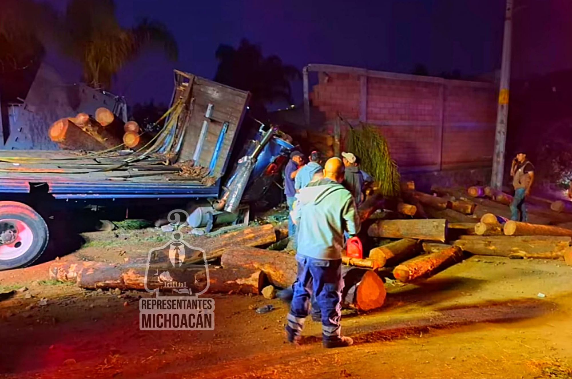 Zitácuaro, Michoacán, 19 de noviembre de 2025.– Un fuerte accidente se registró la tarde de este martes en la carretera Aputzio–Zitácuaro, cuando el conductor de un camión tipo torton, cargado con troncos, perdió el control debido al peso excesivo de la carga, lo que provocó que la unidad volcara antes de llegar al puente de La Pesca.