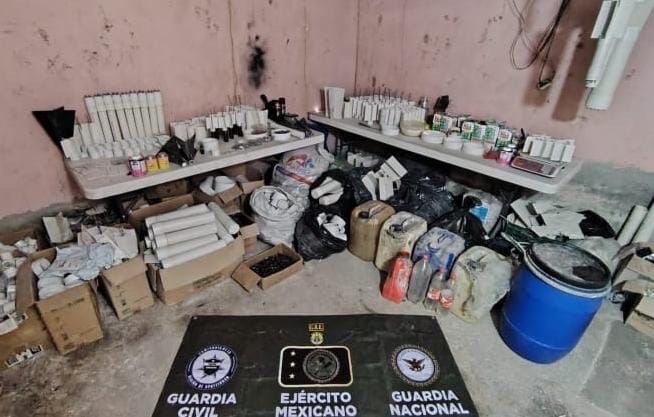 En el lugar también fueron aseguradas herramientas de fabricación como un esmeril de banco, un cortador de metal, un tornillo de banco, soldadoras, máscaras para soldar, dos taladros de banco, además de materiales como tubos, placas metálicas y bidones con líquidos inflamables, similares a gasolina, thinner y ácido.