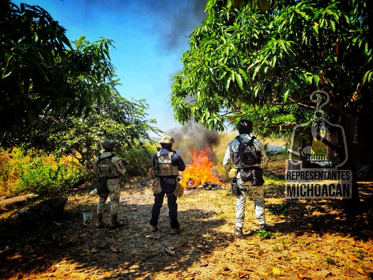 Morelia, Michoacán a 8 de noviembre de 2025.- En una acción coordinada entre autoridades federales y estatales, cuatro campamentos presuntamente vinculados al crimen organizado fueron ubicados y destruidos en el municipio de Buenavista, dentro de la región de Tierra Caliente. Las operaciones se realizaron en las comunidades de Cinco de Mayo y Las Carreras, como parte de un despliegue estratégico para contener actividades ilícitas en zonas rurales del estado.