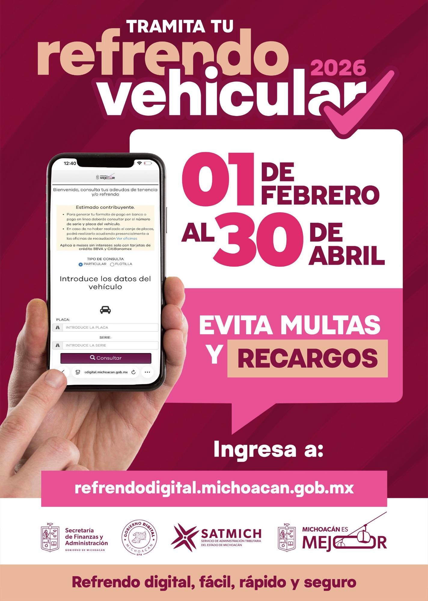 El Gobierno de Michoacán recordó que el proceso puede realizarse de forma rápida y segura a través del portal refrendodigital.michoacan.gob.mx, con el objetivo de facilitar el cumplimiento de esta obligación sin necesidad de hacer filas.