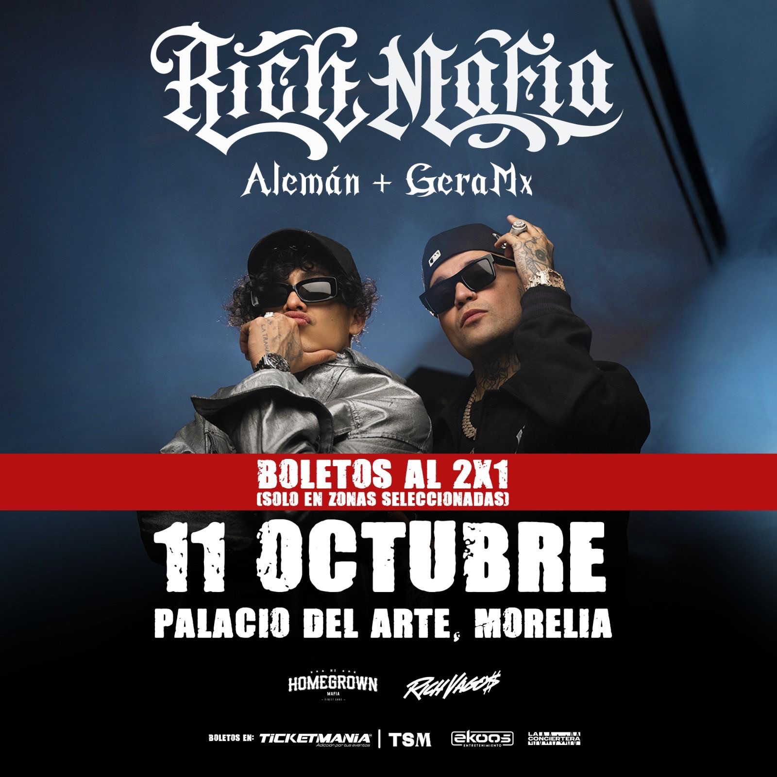 Morelia, Michoacán, 19 de septiembre de 2025.– Los reconocidos raperos mexicanos Alemán y Gera MX llegarán a la capital michoacana con su gira “Rich Mafia”, presentándose el próximo 11 de octubre en el Palacio del Arte.