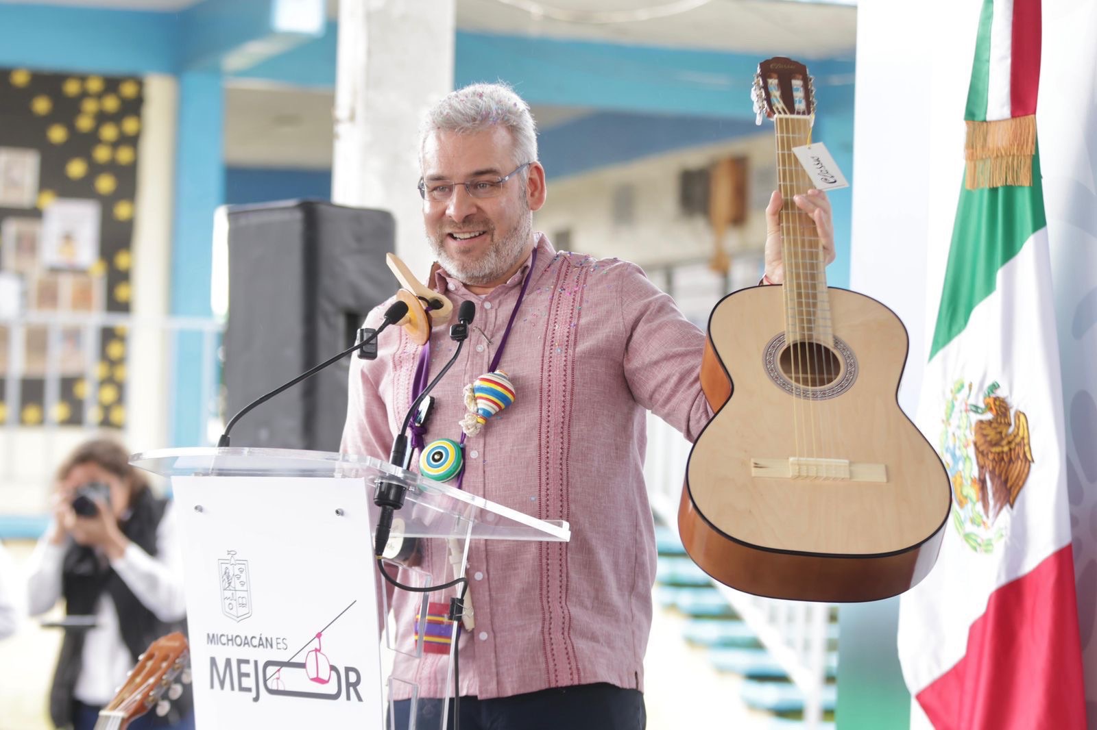 Paracho, Michoacán, 30 de julio de 2025.- El gobernador Alfredo Ramírez Bedolla anunció la entrega de 10 mil guitarras elaboradas en Paracho a escuelas secundarias del estado, como parte del programa “México canta y Michoacán toca con guitarras de Paracho”, con el objetivo de fortalecer la economía local e impulsar la producción artesanal del municipio.