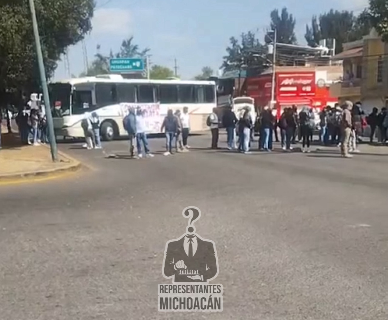 Estudiantes de la Escuela Normal Rural Vasco de Quiroga, ubicada en Tiripetío, realizaron la retención de diversos camiones de reparto y autobuses de turismo sobre el Libramiento de Morelia, en el tramo con dirección hacia la avenida Periodismo.
