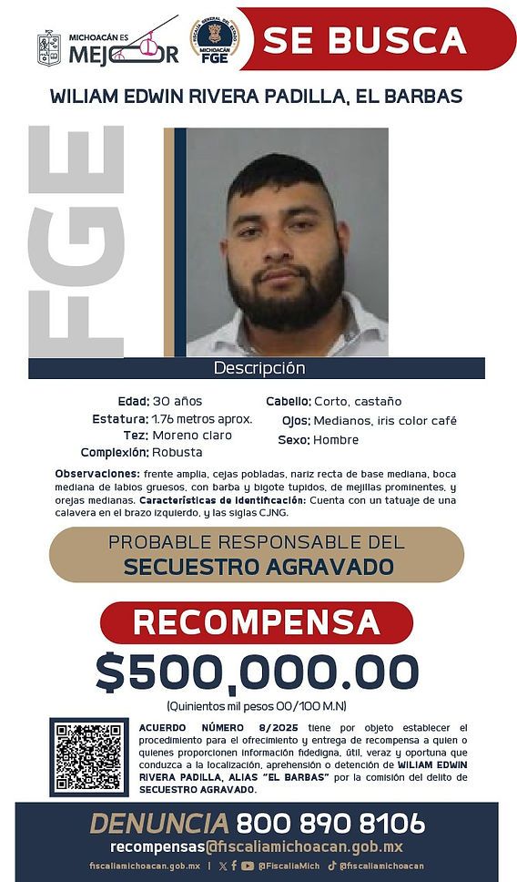 Morelia, Michoacán, a 26 de junio de 2025.– Como resultado de los trabajos de investigación que lleva a cabo la Fiscalía General del Estado de Michoacán (FGE), se logró establecer la presunta responsabilidad de William Edwin Rivera Padilla, el Barbas, en el delito de secuestro agravado, por lo que se ha emitido acuerdo de ofrecimiento de recompensa para quien proporcione información veraz y útil que conduzca a su detención.
