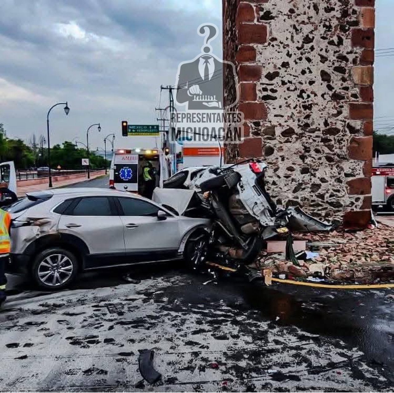 El choque ocurrió cuando la mujer, sin frenar ante el semáforo, impactó a gran velocidad a un Hyundai, el cual fue proyectado directamente contra una de las columnas de cantera del histórico acueducto. El auto quedó completamente destrozado al estrellarse contra la estructura de piedra.