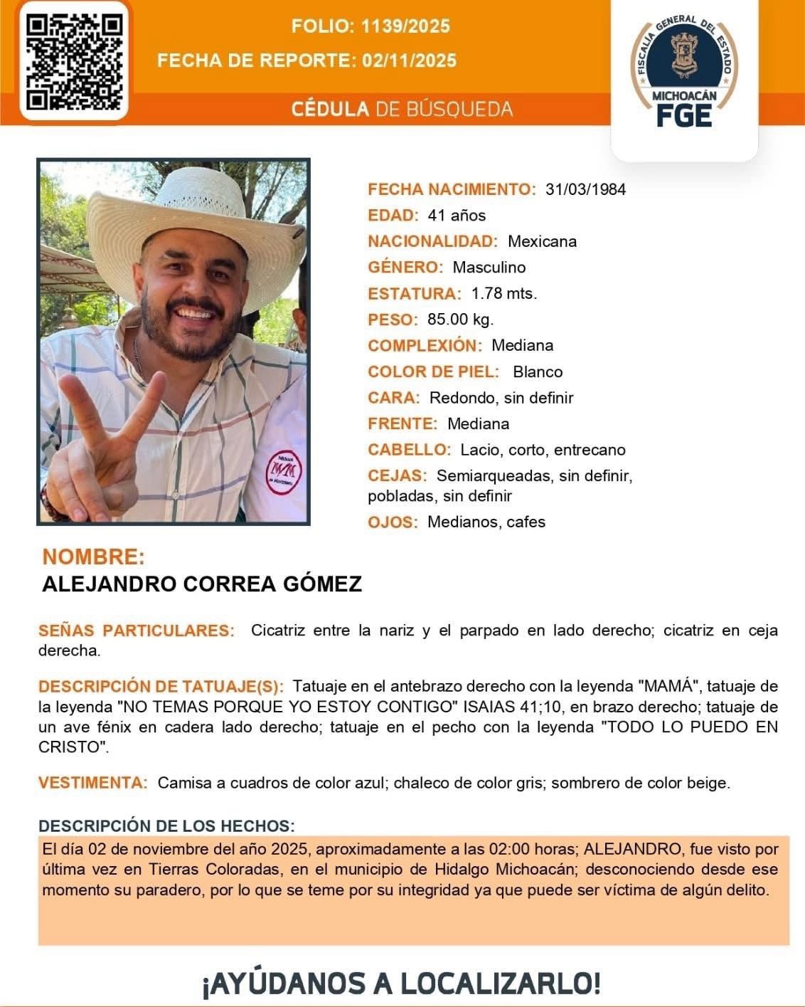Morelia, Michoacán a 4 de noviembre de 2025.- Habitantes de Zinapécuaro han convocado a una marcha pacífica con el propósito de exigir la localización del exalcalde Alejandro Correa Gómez, quien permanece desaparecido desde el domingo 2 de noviembre. La convocatoria, difundida en redes sociales, busca reunir a la ciudadanía este martes 4 de noviembre a las 4:00 de la tarde en la gasolinera Francisco Villa, donde iniciará el recorrido. Los organizadores solicitan a los asistentes acudir con ropa cómoda y portar agua para mantenerse hidratados.