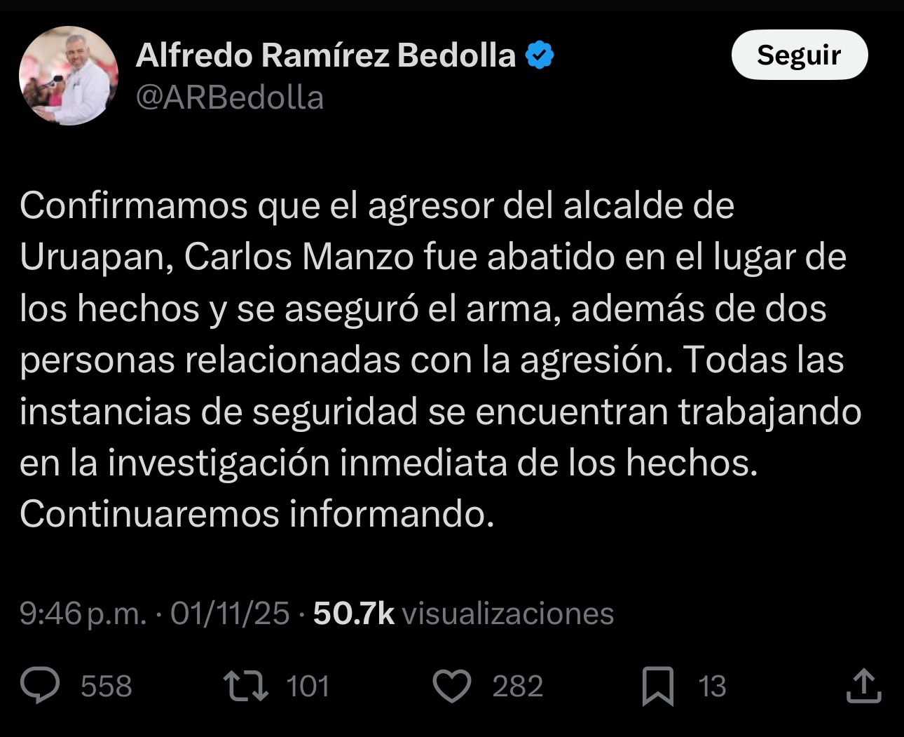 Morelia, Michoacán, 1 de noviembre de 2025.- El gobernador Alfredo Ramírez Bedolla condenó enérgicamente el cobarde atentado en el que perdió la vida el alcalde de Uruapan, Carlos Manzo, por el cual, ya se encuentran dos personas detenidas y una más fue abatida.
