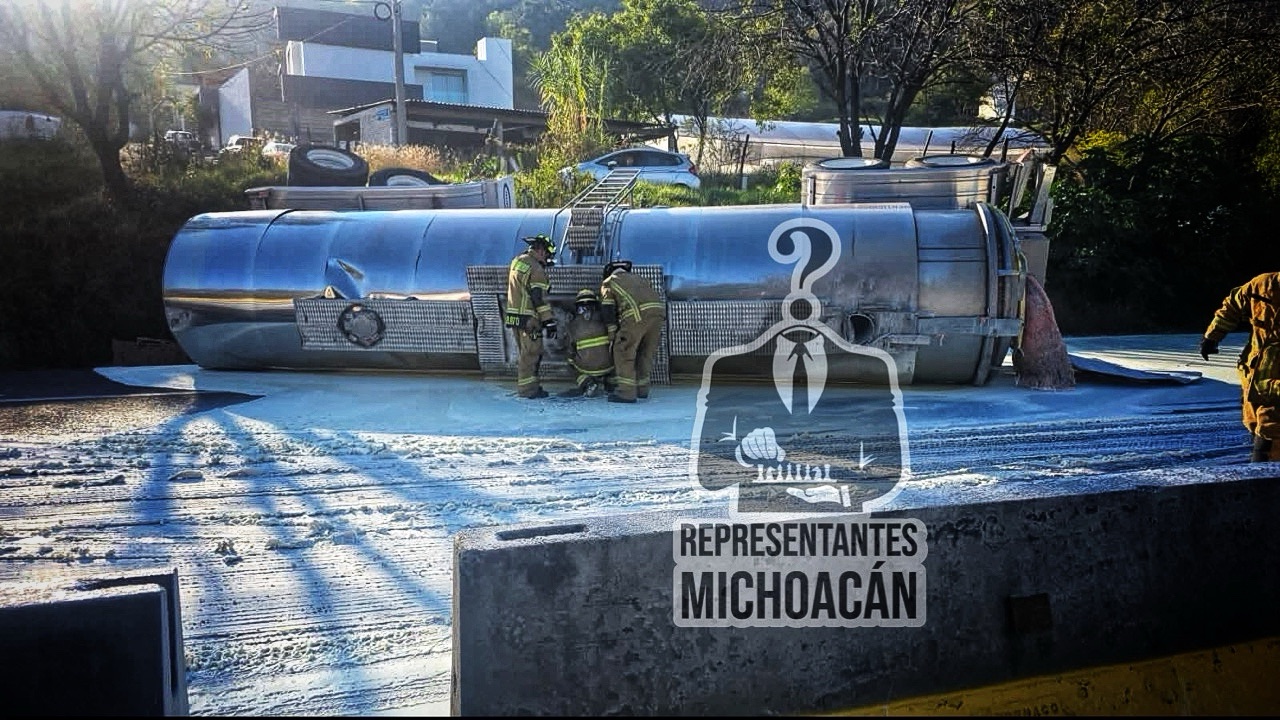 Morelia, Michoacán a 27 de diciembre de 2025.- La volcadura de una pipa sobre la carretera Morelia–Pátzcuaro, a la altura de la localidad de Cointzio, provocó la movilización de cuerpos de emergencia y el cierre total de la circulación la tarde de este jueves. El vehículo transportaba aceite de palma cuando sufrió el accidente frente al Motel Monarca.