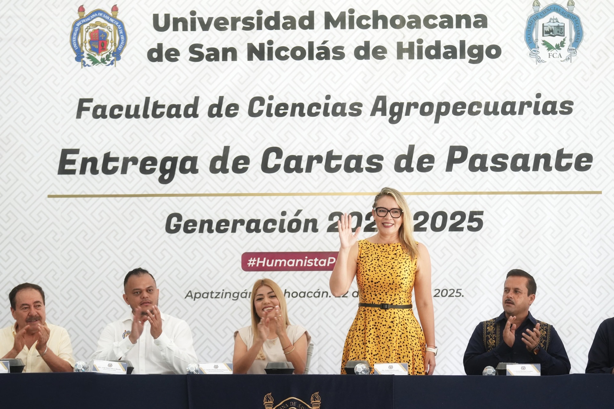 Apatzingán, Michoacán, 23 de agosto de 2025.- La rectora de la Universidad Michoacana de San Nicolás de Hidalgo (UMSNH), Yarabí Ávila González, refrendó su compromiso de fortalecer la Facultad de Ciencias Agropecuarias de Apatzingán, durante la ceremonia de entrega de cartas de pasante a egresadas y egresados de las licenciaturas en Ingeniero Agrónomo Horticultor y en Administración de Empresas.